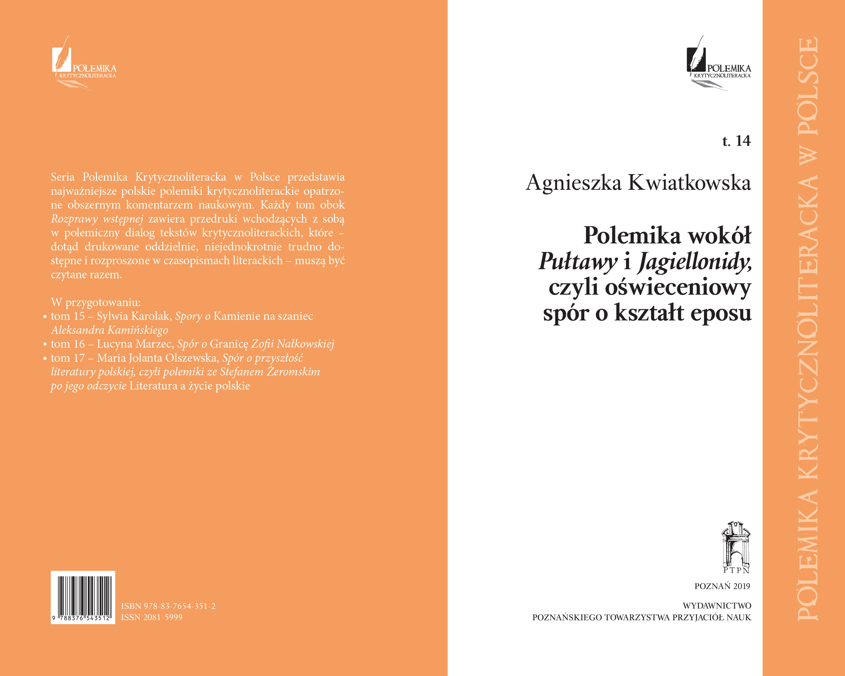 | dc.identifier.citation | Agnieszka Kwiatkowska, Polemika wokół „Pułtawy” i „Jagiellonidy”, czyli oświeceniowy spór o kształt eposu, Wydawnictwo Poznańskiego Towarzystwa Przyjaciół Nauk, Poznań 2019, ISBN 978-83-7654-351-2 (Polemika Krytycznoliteracka w Polsce, pod redakcją Sylwii Panek, tom 14), ss. 278. | pl |