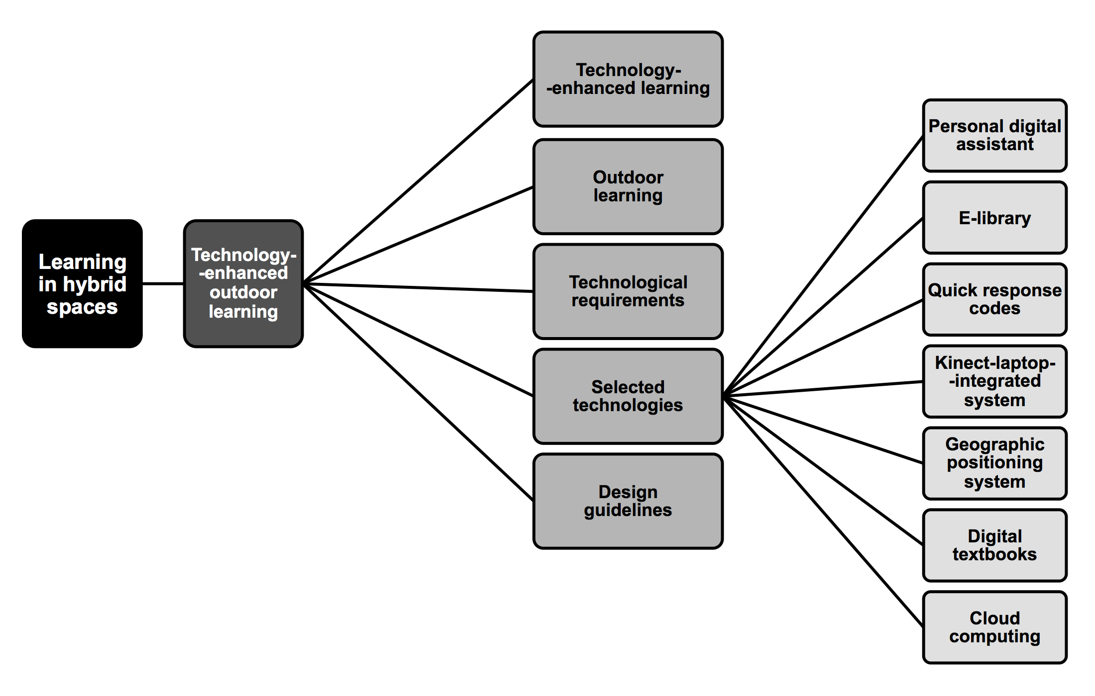 One of the ideas for improving urban green spaces is adding to them a virtual dimension, or - in other words - equipping them with some kind of technological infrastructure. Such spaces, combining a nature with technology, are named in many terms, e.g. outdoor cyber-mediated spaces, technologically enhanced urban green spaces, blended digital/urban green spaces or - what is the most precise - hybrid spaces. Hybrid space is quite innovative solution, because traditionally the natural environment and digital domains are seen as distinctly different. In addition, researchers agree that hybrid spaces offer an attractive learning context. Although little is known about learning in hybrid spaces. This paper defines learning in hybrid spaces as a technology-enhanced outdoor learning and discusses contextual key terms as technology-enhanced learning and outdoor learning, and also technological requirements for technology-enhanced outdoor learning, selected technologies of technology-enhanced outdoor learning such as personal digital assistant, e-library, quick response codes, Kinect-laptop-integrated system, geographic positioning system, digital textbooks, cloud computing; and finally design guidelines for technology-enhanced outdoor learning. This can be useful for anyone interested in educational use of hybrid spaces.