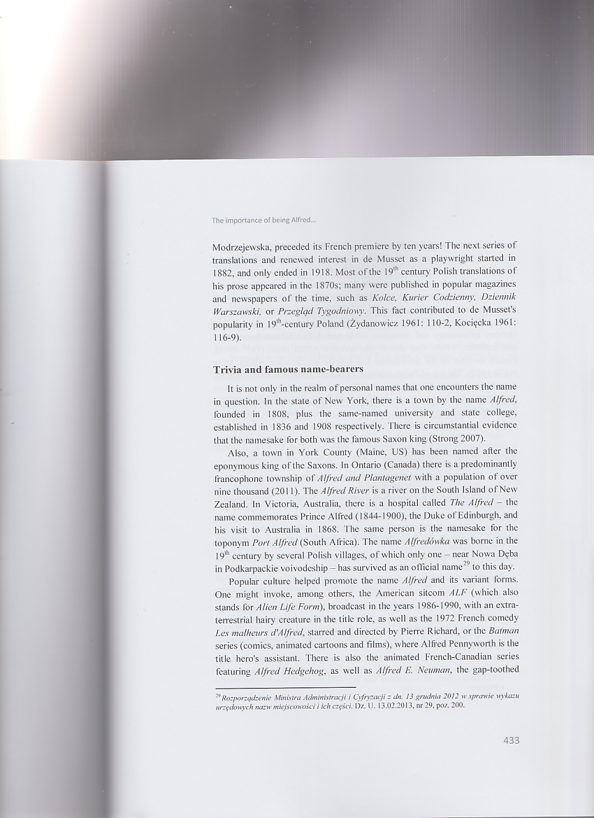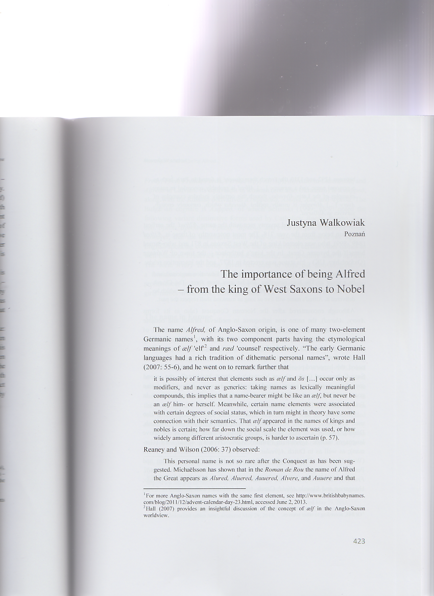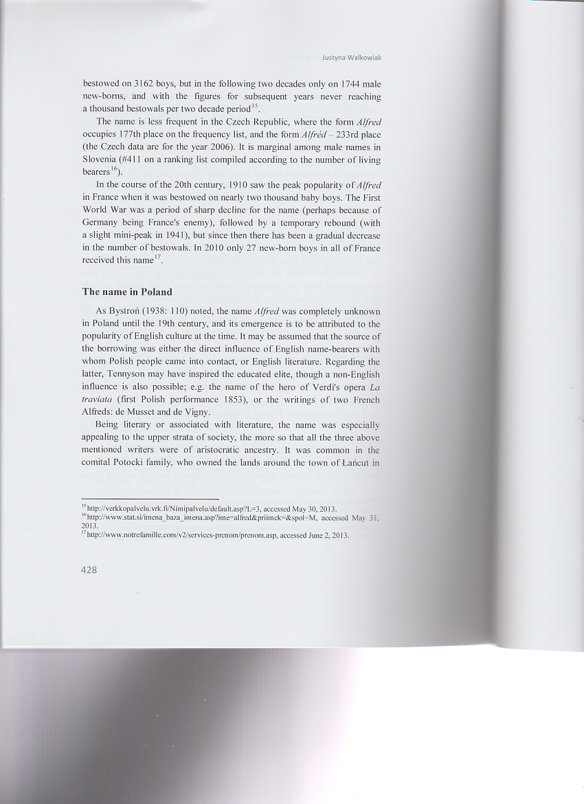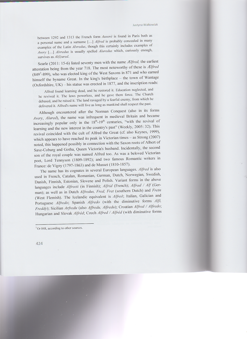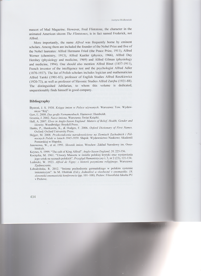 The article appeared in a Festschrift devoted to a distinguished Polish linguist Professor Alfred F. Majewicz. It discusses the Christian name Alfred born by the Jubilarian in its various aspects: its Anglo-Saxon origins, etymology and popularity (past and present) in various European countries, with particular emphasis on Poland. It also presents some famous people, literary characters and pop culture heroes bearing this name.