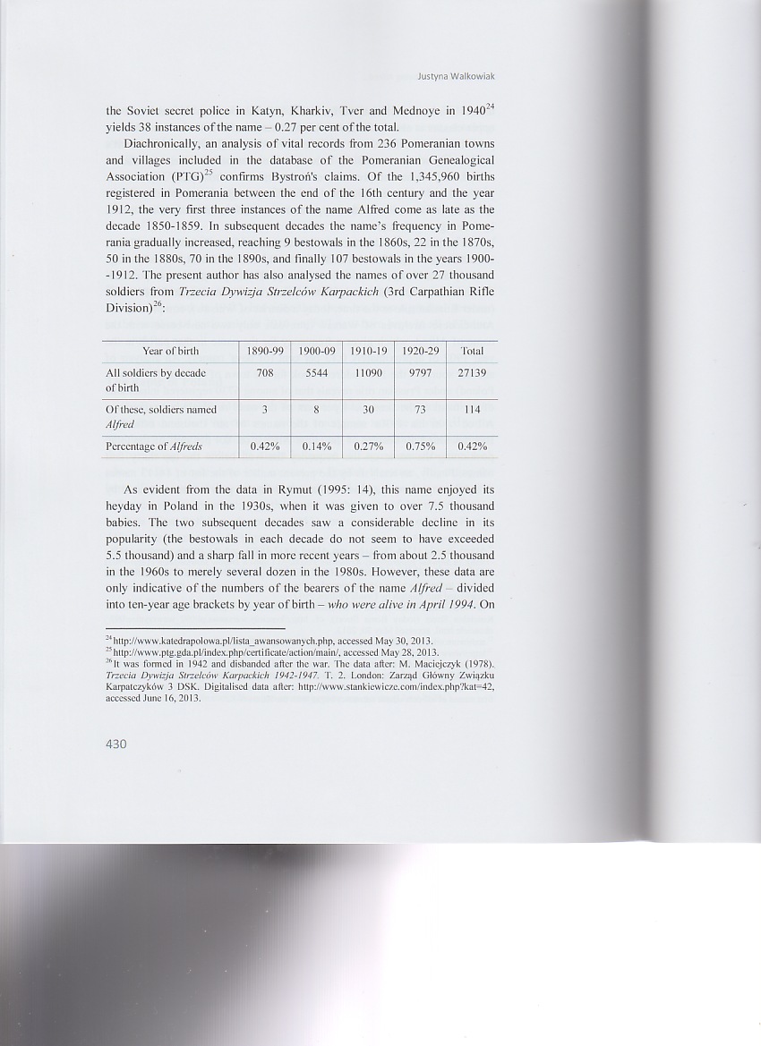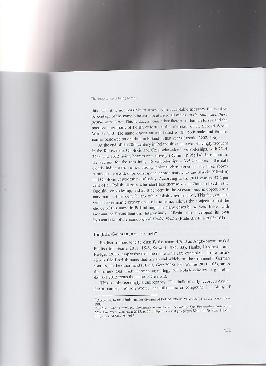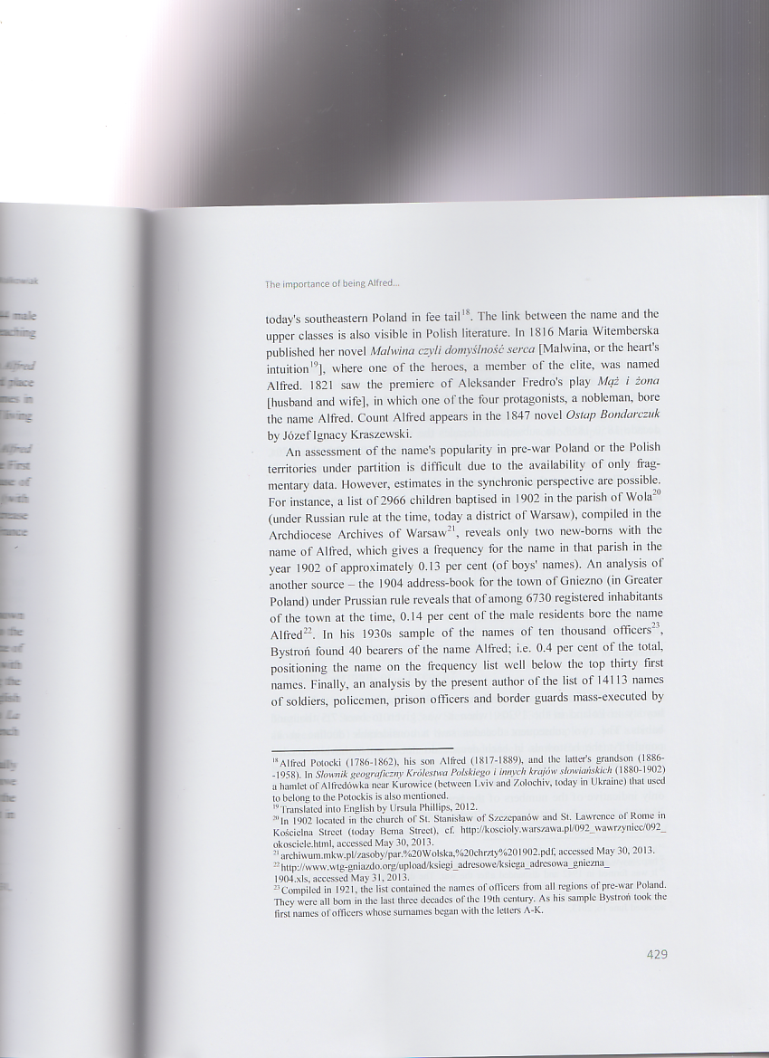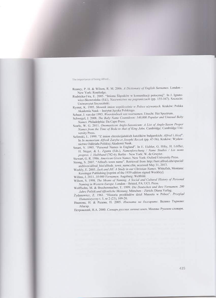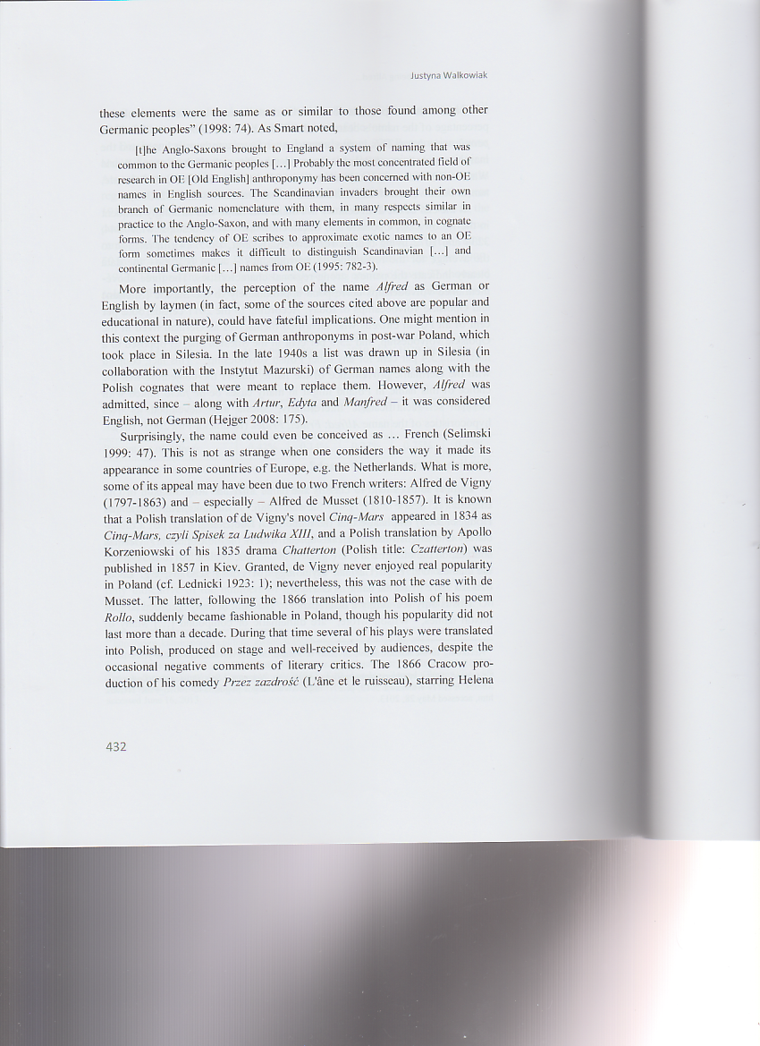 The article appeared in a Festschrift devoted to a distinguished Polish linguist Professor Alfred F. Majewicz. It discusses the Christian name Alfred born by the Jubilarian in its various aspects: its Anglo-Saxon origins, etymology and popularity (past and present) in various European countries, with particular emphasis on Poland. It also presents some famous people, literary characters and pop culture heroes bearing this name.
