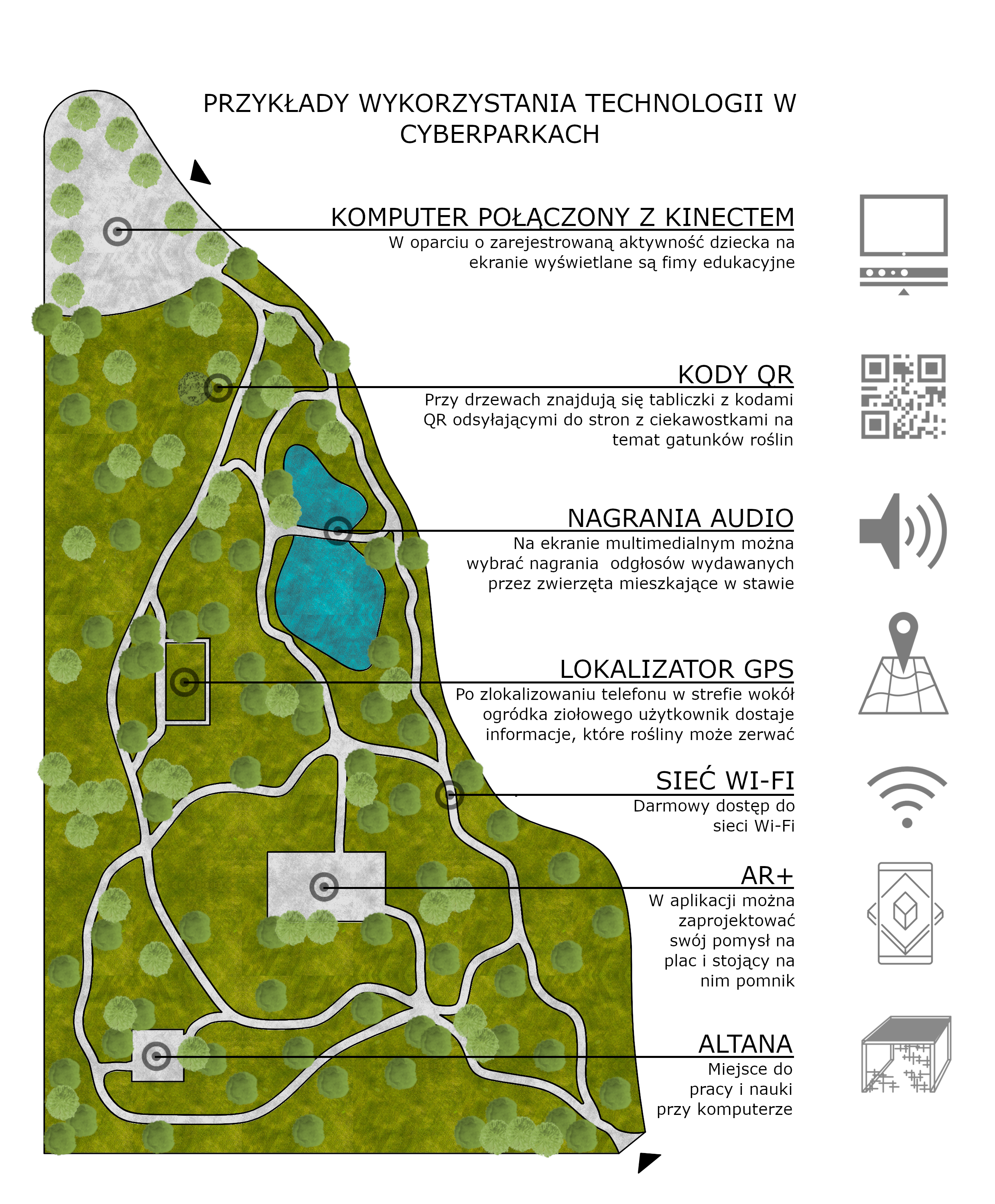 CyberParks will be hybrid spaces of future cities. Learning in CyberParks will take the form of technology-enhanced outdoor learning and will become an important concept that can be used in practice in order to provide an answer to numerous problems of educational institutions, related to students’ lack of contact with nature and consolidation of their sedentary lifestyle. In this paper we discuss evidences from the CyberParks COST project and we present recommendations regarding the constructions of CyberParks. We point, for example, that when designing CyberParks, one has to think not only about the technological infrastructure, but also about making sitting spots for using learning technology. We also present the original project of such an object.